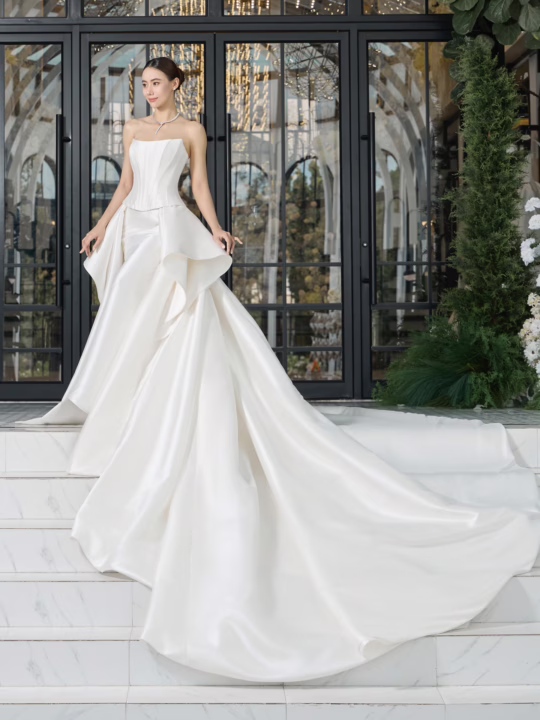 ชุดเจ้าสาวทรงเอไลน์ผ้าไหม 𝘔𝘪𝘤𝘢𝘥𝘰 ”𝘉𝘦𝘢𝘶𝘵𝘪𝘧𝘶𝘭 𝘱𝘢𝘪𝘯“ ความงดงามจากพันธการของรูปร่างด้วย 𝘊𝘰𝘳𝘴𝘦𝘵 ค่านิยมของผู้หญิงในยุควิคตอเรียน คืออินสไปร์ในการออกแบบตัวเสื้อโอบรัดรูปร่างให้เอวคอด ไหล่ผายสง่า สวบทับกระโปรงเอไลน์ เพิ่มเลเยอร์ด้วย 𝘰𝘷𝘦𝘳𝘴𝘪𝘻𝘦𝘥 𝘴𝘬𝘪𝘳𝘵 ที่สามารถถอดออกได้