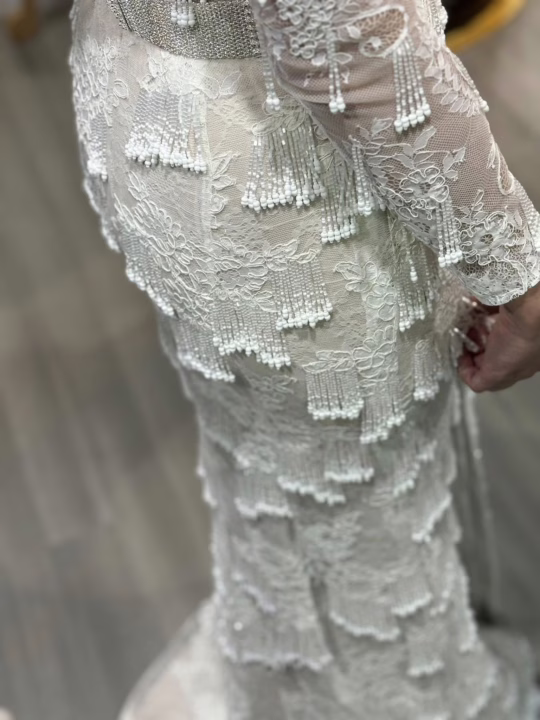 ดีเทลเด่นของชุดนี้คือ 𝖿𝗋𝗂𝗇𝗀𝖾 ลูกปัดสีขาวนับหมื่นเม็ด
