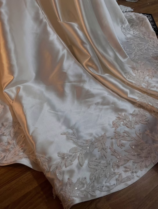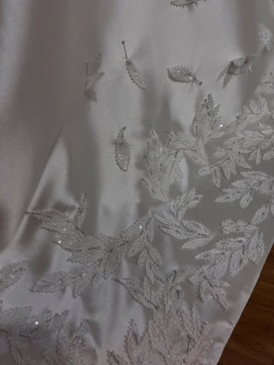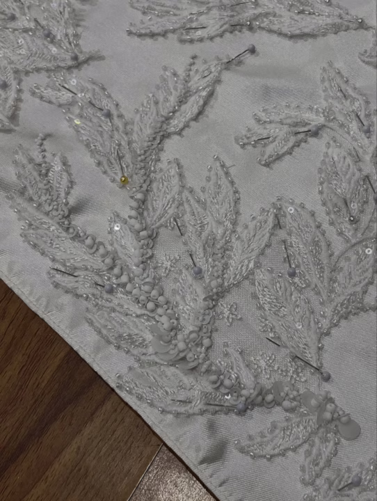 Crafted flowing patterns that harmonize with bold embroidery to create a surreal dimension on the silk wedding gown. ✨