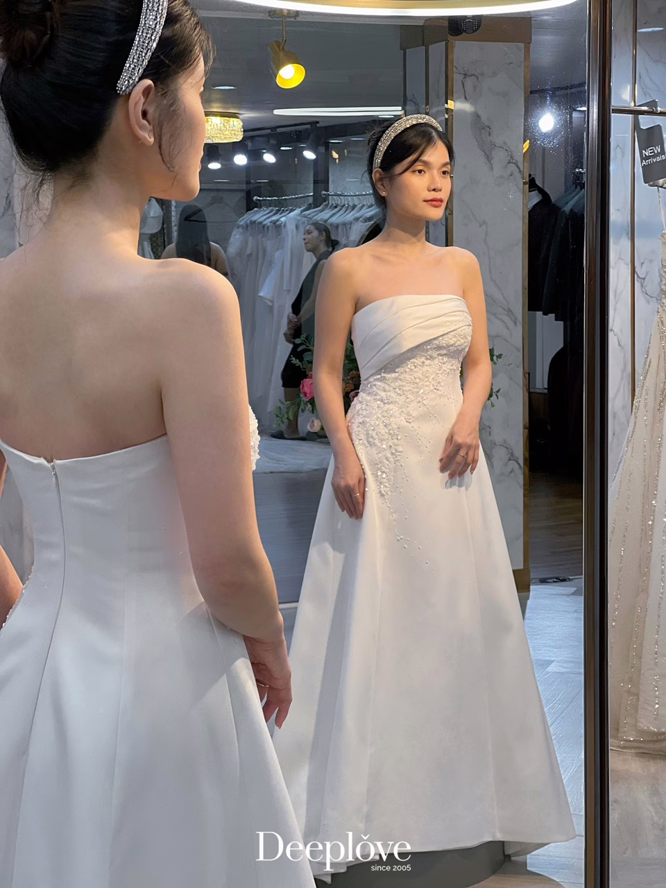 ชุดเจ้าสาวมินิมอล ทรงเอไลน์ ผ้า Silk Dutchess ดีไซน์เกาะอกจับเดรปที่ช่วงอก