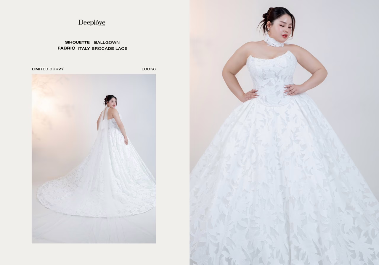 ชุดเจ้าสาวพลัสไซส์ ทรงบอลล์แกว ผ้า Italy brocade lace ฉลุทั้งผืนเป็นลวดลายพิเศษ ด้านบนเป็นเกาะอกคว้าน